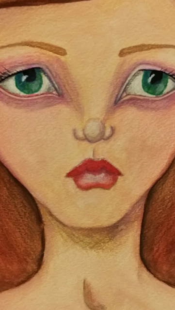 | I decided I didn't like how dark the eyes were, so I blotted them out as best I could and went over them with a lighter brown. I added more shading around the eyes, nose, and chin/neck area and fixed her crooked nose. I also decided to try to even out her lips... with a red that was WAY to bright for the page... |